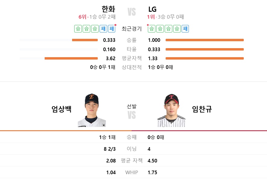 **예상선발투수**: LG 임찬규 - 한화 엄상백